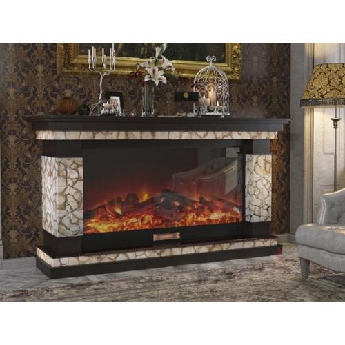 Каминокомплект «Лорд 14» от производителя Glenrich оборудован широкоформатной топкой «Premier S14», а в его конструкции используется сочетание искусственного камня цвета Карелия и МДФ в цвете венге. Большие габариты изделия делают актуальной его установку в помещениях большой площади – просторных залах, холлах гостиниц. Выполнен портал комплекта в классическом стиле, но при этом он отлично сочетается с современной топкой. Обрамляющие очаг стенки оформлены камнем в сочетании со вставками из МДФ сверху и снизу. Мощная каминная крышка имеет ступенчатую конструкцию кромки, а ее верхняя поверхность ровная. Это позволяет дополнительно украсить камин декоративными элементами. В нижней части портала расположено невысокое основание, позволяющее приподнять топку над уровнем пола. Пространство непосредственно перед очагом оформлено изразцами, выполненными в черном цвете.